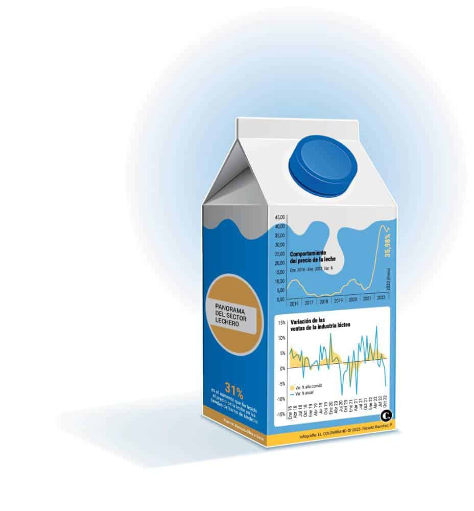 Y en efecto, el mayor precio de la leche al consumidor comenzó a pasar factura a las ventas de la industria, las cuales registraron caídas anuales en octubre (2,8%), noviembre (9,4%) y diciembre (8,3%) de 2022, según el Dane.